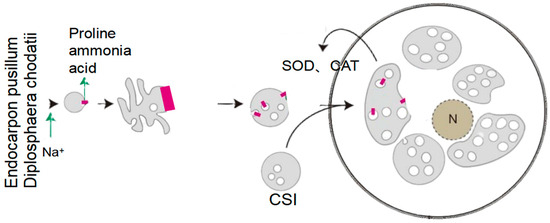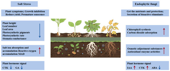 Endophytic fungi cultivate symbiotic relationships through the production of secondary bioactive metabolites. Within these ecosystems, these microorganisms not only obtain essential nutrients and protective mechanisms from host plants but also release bioactive stimulants to promote plant growth and development. In prolonged saline–alkaline environments, plants and endophytic fungi develop a synergistic resistance mechanism through genetic co-selection and metabolic complementarity. This dynamic partnership effectively regulates plant physiological functions while enhancing their stress tolerance capabilities [5,6].
