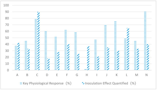 Field trials focus on practical application effects in saline–alkali lands (ECe > 4 dS/m, pH 8.5–9.5). Table 3 compares 10 representative studies, showing that fungal inoculation can increase crop yield by 15–40%, but the effect is modulated by environmental factors. For example, Aspergillus flavus increased rice yield by 32% in coastal saline soil (pH 8.7), but its colonization rate decreased from 85% in the lab to 52% in the field [35]. Composite inoculants (e.g., Penicillium + Trichoderma) exhibit greater stability: in Xinjiang saline–alkali cotton fields (pH 9.2), dual inoculation increased cotton fiber yield by 40% and maintained rhizosphere microbial diversity by secreting cyclic hexapeptides (cyclo-(L-Pro-L-Tyr)) [50,51]. Figure 4 clearly shows the change in key indicators. Current bottlenecks lie in the attenuation of colonization efficiency in the field (typically 30–50%) and disruption of metabolite synthesis by environmental fluctuations (e.g., temperature fluctuations causing a 60% decrease in flavonoid derivative production), which need to be addressed through synthetic biology modification of fungi or the development of encapsulated delivery systems [52].