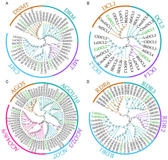 Phylogenetic analysis of the gene families in the RdDM pathway, proteins from various species, including cucumber (Cucumis sativus, abbreviation: Cs, 67 genes), Arabidopsis (Arabidopsis thaliana, abbreviation: At, 28 genes), wax gourd (Benincasa hispida, abbreviation: Bh, 21 genes), watermelon (Citrullus lanatus, abbreviation: Cl, 23 genes), pumpkin (Cucurbita moschata, abbreviation: Cmo, 32 genes), bottle gourd (Lagenaria siceraria, abbreviation: Ls, 23 genes), melon (Cucumis melo, abbreviation: Cme, 20 genes), and tomato (Solanum lycopersicum, abbreviation: Sl, 32 genes) were used in the analysis. Each node supports 1000 replicates. Phylogenetic tree of DNA methyltransferase (DNMT) proteins (A), Dicer-like (DCL) proteins (B), Argonaute (AGO) proteins (C), and RNA-dependent RNA polymerase (RDR) proteins (D). Different colors of branches in the same phylogenetic tree represent different subgroups.