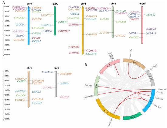 Gene location and Collinearity analysis of the RdDM genes in cucumber. (A) Chromosomal localization of RdDM genes in the cucumber genome. (B) Collinearity analysis of RdDM genes in the cucumber genome. Red lines denote collinear gene pairs among RdDM family members.