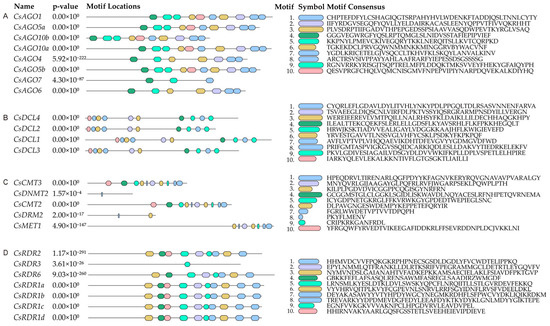 Motif analysis of the main gene families involved in the RdDM pathway. (A) CsAGO gene family; (B) CsDCL gene family; (C) five methyltransferase genes, including CsCMT3, CsDNMT2, CsCMT2, CsDRM2, and CsMET1; (D) CsRDR gene family.