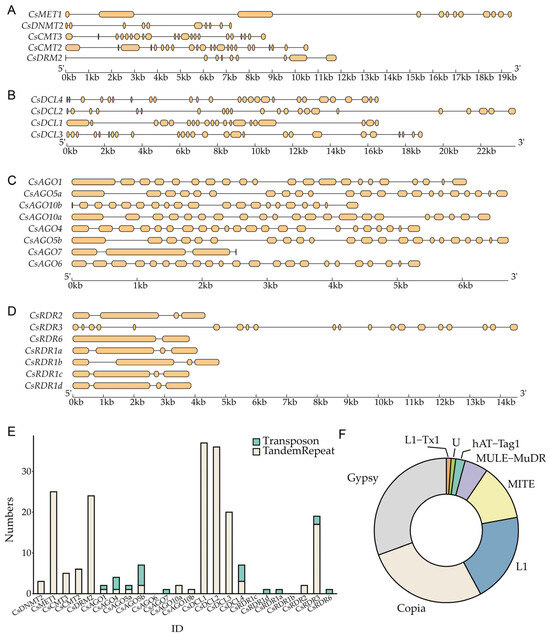 The gene structures of five methyltransferases (CsMET1, CsDNMT2, CsCMT3, CsCMT2, CsDRM2) and the three main gene families in the RdDM pathway (CsAGO, CsRDR, CsDCL) (A–D). (E) The distribution of internal repetitive sequences in five methyltransferases (CsMET1, CsDNMT2, CsCMT2, CsCMT3, CsDRM2), and the three main gene families in the RdDM pathway (CsAGO, CsRDR, CsDCL), where blue represents Transposons, and ochre represents Tandem Repeats. (F) The distribution types of internal repetitive sequences in five methyltransferases (CsMET1, CsDNMT2, CsCMT3, CsCMT2, CsDRM2), and the three main gene families in the RdDM pathway (CsAGO, CsRDR, CsDCL).