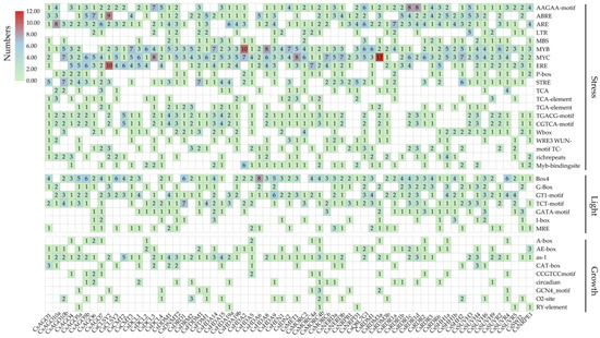 To investigate potential regulatory mechanisms of CsRdDM gene expression, the 2000 bp upstream promoter sequences were analyzed for cis-regulatory elements using the PlantCARE database (Figure 5). A total of 110 distinct cis-elements were identified and categorized into three major functional groups: stress-responsive, light-responsive, and growth/development-related.