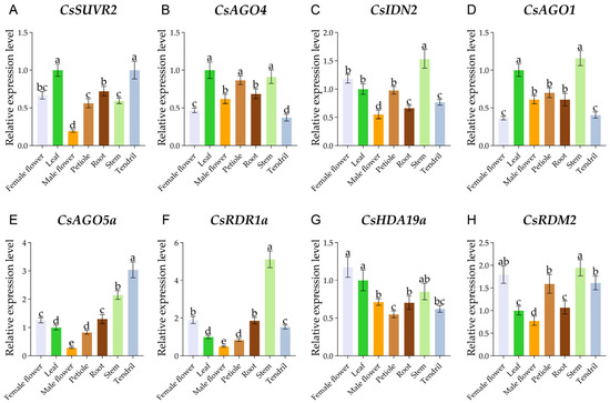 Relative expression of the eight CsRdDMs with the highest expression in roots in seven different tissues, including (A) CsSUVR2, (B) CsAGO4, (C) CsIDN2, (D) CsAGO1, (E) CsAGO5a, (F) CsRDR1a, (G) CsHDA19a, and (H) CsRDM2. The data presented in the graphs are expressed as the mean ± SD. Different letters denote statistically significant differences as determined by one-way ANOVA with Tukey’s post-hoc test (p < 0.05).