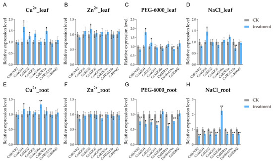 Expression analysis of CsRdDMs in leaf tissues under the treatment of Cu2+ (A), Zn2+ (B), PEG-6000 (C), and NaCl (D), and root tissues under the treatment of Cu2+ (E), Zn2+ (F), PEG-6000 (G), and NaCl (H) using RT-qPCR. CK (Control group) represents plants grown in standard Hoagland’s solution. The data presented in the graphs are expressed as the mean ± SD. Asterisks indicate a significant difference between the treatment and its corresponding control group for each gene, as determined by a two-tailed Student’s t-test (* p < 0.05, ** p < 0.01).