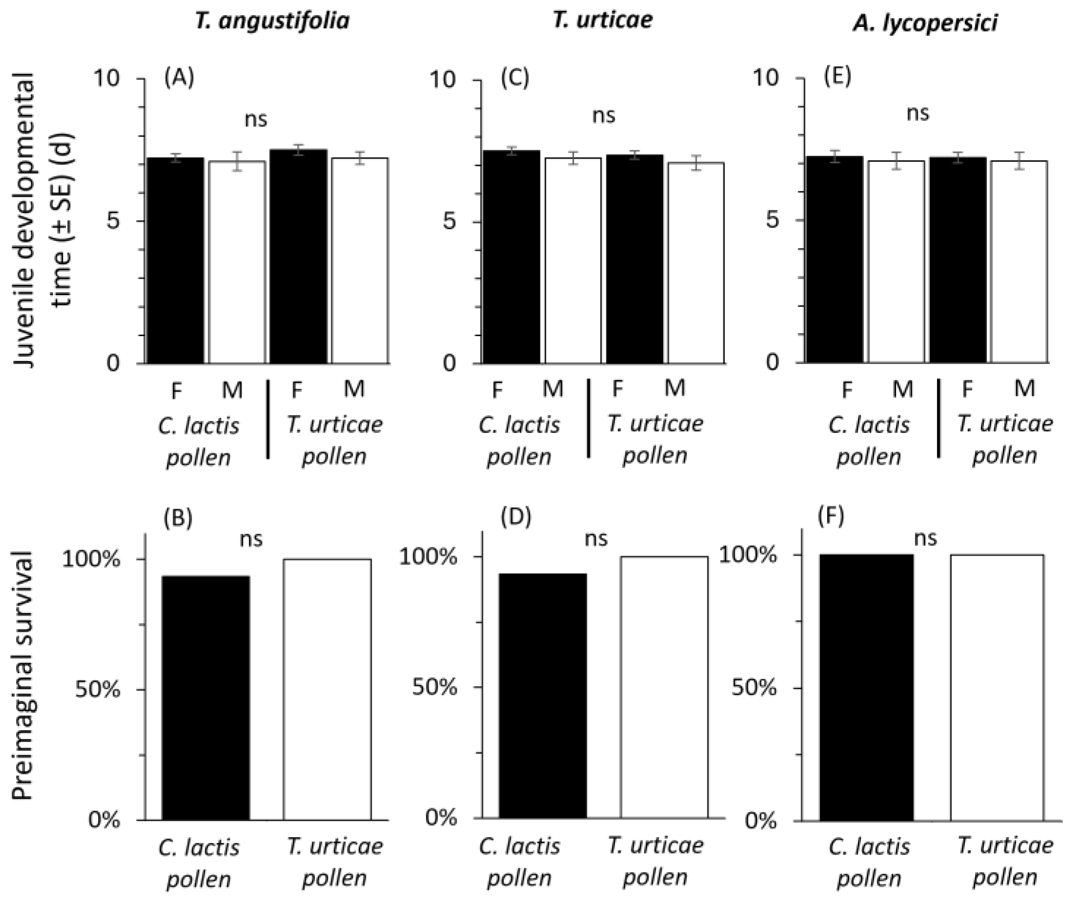 - Nemati, A.; Riahi, E. Does feeding on pollen grains affect the performance of Amblyseius swirskii (Acari: Phytoseiidae) during subsequent generations? Bull. Entomol. Res. 2020, 110, 449–456. [Google Scholar] [CrossRef]