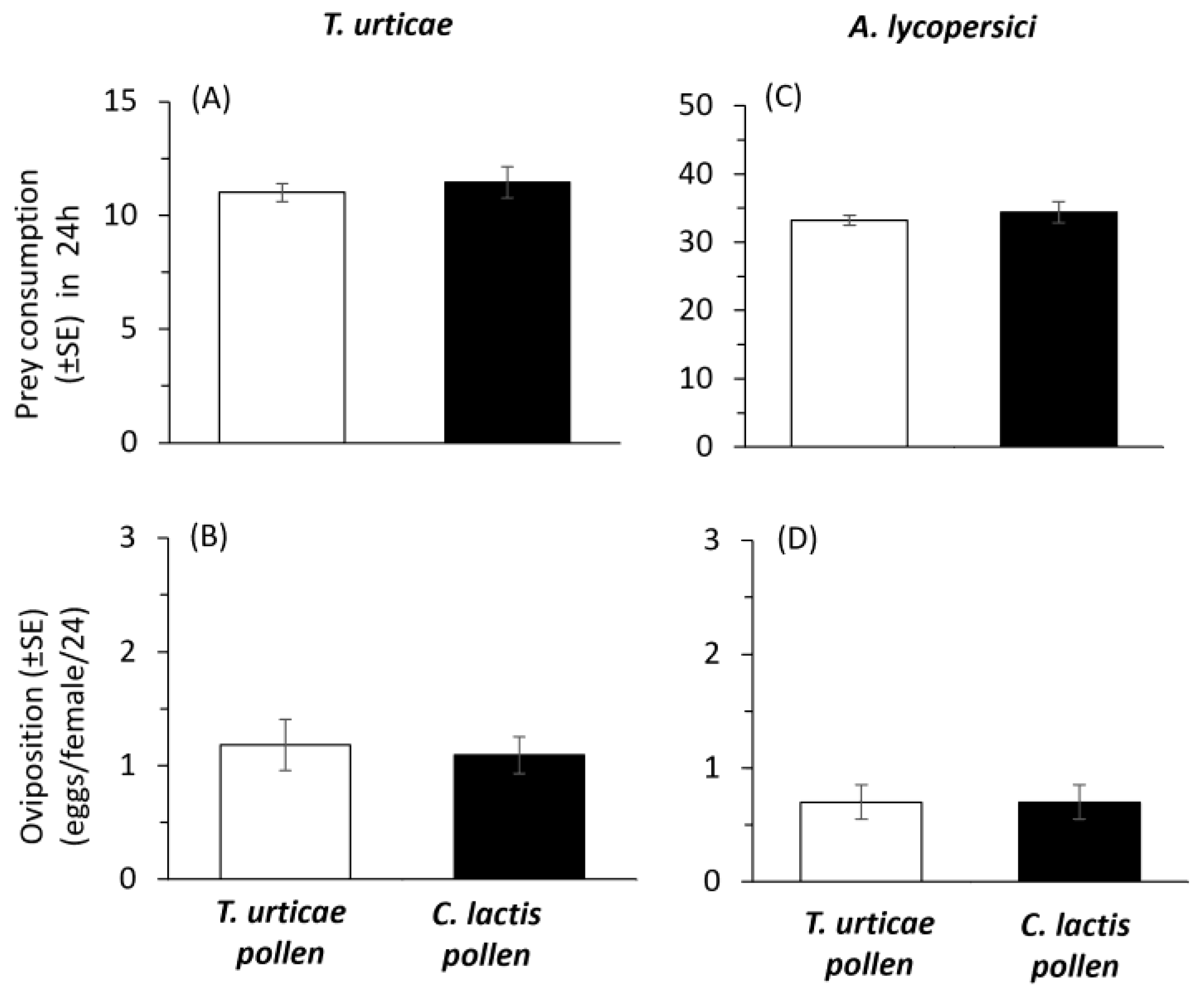 - Samaras, K.; Pappas, M.L.; Fytas, E.; Broufas, G.D. Pollen provisioning enhances the performance of Amblydromalus limonicus on an unsuitable prey. Front. Ecol. Evol. 2019, 7, 122. [Google Scholar] [CrossRef]