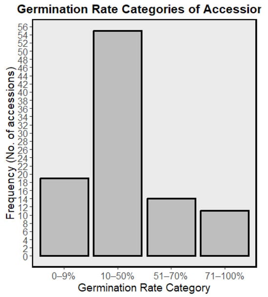 Histogram showing the distribution of germination rates (%) among the 99 accessions; bars indicate the number of accessions per viability class.