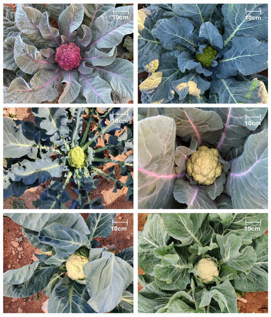 Representative examples of morphological diversity in the COMAV cauliflower collection. The six photographs illustrate variation in plant architecture, leaf colour, lobing, blistering, leaf contour, petiole pigmentation, and curd colour/structure (white, green-Romanesco, yellow-green and purple). All pictures were taken in the field with a smartphone mounted on a tripod 1.5 m above the plant; scale bar = 10 cm.