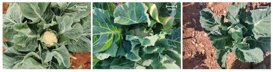 The field trial was placed in Cheste, Valencia (39°29′38.8″ N 0°41′32.6″ W), during the 2022–2023 season. The electrical conductivity of the soil ranged from 0.82 to 1.21 dS/m throughout the cultivation cycle. The average daily temperatures varied between 3 and 20 °C, thus the plants accumulated about 600 chill hours, according to meteorological station reports []. Climate records from the IVIA-Cheste Agrometeorological Station (http://riegos.ivia.es/, accessed on 31 May 2025) indicate a mean annual rainfall of 430 mm, concentrated in autumn and spring. Drip irrigation was scheduled to maintain the soil at 70% of field capacity, delivering 250 mm of water during the cycle. Fertigation supplied a total of 180-60-240 kg ha−1 of N-P2O5-K2O (split in eight weekly applications) following regional cauliflower guidelines [].