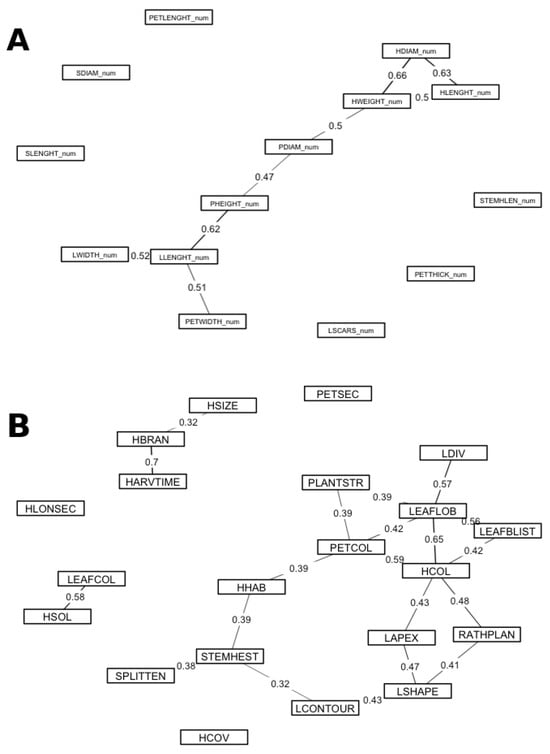 For quantitative traits, several strong Spearman correlations (|ρ| ≥ 0.40; FDR ≤ 0.05) defined coherent modules of curd size and vegetative architecture (Figure 5A). The strongest links were head weight with head diameter (HWEIGHT_num–HDIAM_num, ρ ≈ 0.66), head diameter with head length (HDIAM_num–HLENGHT_num, ρ ≈ 0.63), and leaf length with plant height (LLENGHT_num–PHEIGHT_num, ρ ≈ 0.62). Head weight also scaled with head length (HWEIGHT_num–HLENGHT_num, ρ ≈ 0.50) and plant width (HWEIGHT_num–PDIAM_num, ρ ≈ 0.50). Plant size covaried internally (PHEIGHT_num–PDIAM_num, ρ ≈ 0.47). Leaf length formed a vegetative dimension with leaf width (LLENGHT_num–LWIDTH_num, ρ ≈ 0.52) and petiole width (LLENGHT_num–PETWIDTH_num, ρ ≈ 0.51). Petiole thickness associated with petiole width (PETTHICK_num–PETWIDTH_num, ρ ≈ 0.42) and with head weight (PETTHICK_num–HWEIGHT_num, ρ ≈ 0.44). These patterns agree with previous reports that larger plants tend to develop broader foliage and heavier curds [,,,,,,,].