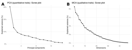Scree plots for block-wise ordinations. (A) PCA scree plot for the 15 quantitative traits; the curve shows the percentage of variance explained by each principal component. (B) MCA scree plot for the 21 qualitative traits; the curve shows the percentage of variance explained by each dimension. Both panels display a gradual eigenvalue decay with no single dominant axis.