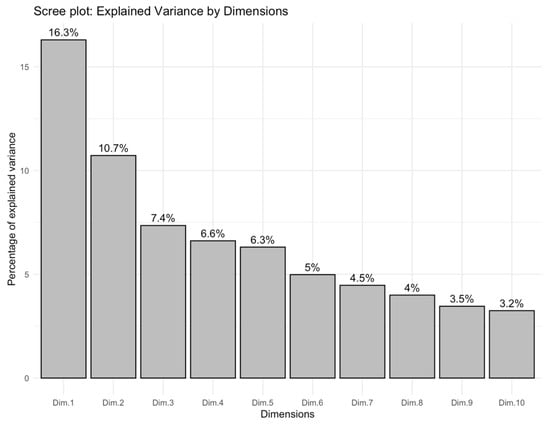 Scree plot of the percentage of variance explained by the first ten FAMD dimensions.