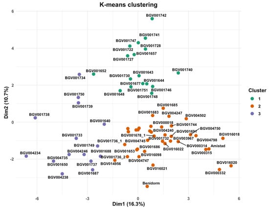 The k-means partition of the FAMD scores (first ten dimensions) yielded three groups (k = 3; average silhouette ≈ 0.17), indicating modest separation with partial overlap in the Dim-1/Dim-2 projection (Figure 8). The three clusters mainly split the collection along curd size/architecture and earliness/colour axes, consistent with the association networks and block-wise ordinations. Although the partition was obtained with ten axes, the two-dimensional scatterplot already shows partial separation with overlap among the three groups, consistent with the k-means solution from the full multidimensional space.