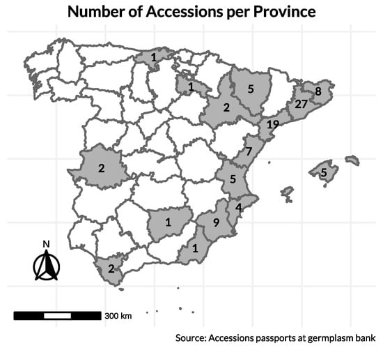 Geographic origin of the landrace accessions stored in the COMAV genebank and later sown; numbers indicate accessions per province. Commercial checks (‘Benidorm’, ‘Amistad’) are not included in province counts.