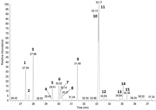 Chromatogram of Jm-EO by GC-MS. 1, α-cedrene; 2, β-cedrene; 3, thujopsene; 4, β-chamigrene; 5, zingiberene; 6, β-himachalene; 7, α-selinene; 8, cuparene; 9, 8,14-cedranoxide; 10, widdrol; 11, cedrol; 12, 8-cedren-15-ol; 13, 8-cedren-13-ol; 14, valerenol; 15, valerenal.