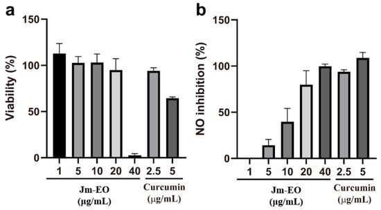 Effects of Jm-EO on RAW 264.7 macrophage cell viability and nitric oxide (NO) production. (a) Cytotoxicity of Jm-EO (1–40 μg/mL) and curcumin (2.5 and 5 μg/mL) on RAW 264.7 cells after 24 h of treatment, determined by MTT assay. (b) Inhibitory effects of Jm-EO and curcumin on NO production in lipopolysaccharide (LPS)-stimulated RAW 264.7 cells. Cells were treated with LPS (1 μg/mL) in the presence or absence of Jm-EO or curcumin for 24 h. Data are presented as mean ± SD from three independent experiments.