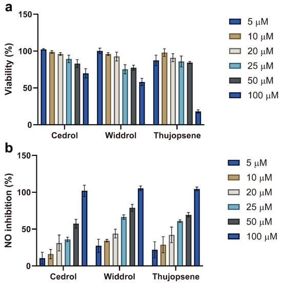 After evaluating the whole essential oil, the anti-inflammatory potential of its three major components—cedrol, widdrol, and thujopsene—was further investigated. Their cytotoxicity and inhibitory effects on NO production were assessed in RAW 264.7 cells across a concentration range of 5–100 μM (Figure 3).