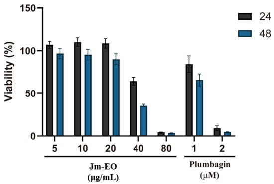 As anticipated, plumbagin showed strong cytotoxicity: 1 μM decreased cell viability to 84% (24 h) and 66% (48 h), while 2 μM reduced viability to 10% and 5%, respectively. Based on these results, the IC50 of Jm-EO against HepG2 cells after 48 h was estimated at approximately 41.5 μg/mL.