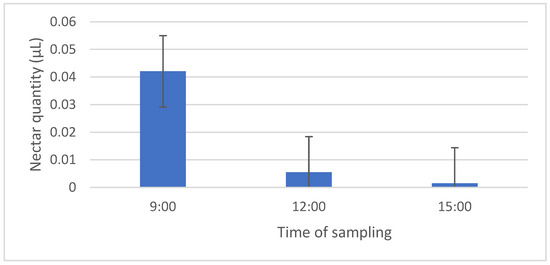 The highest amount of nectar was secreted in the morning hours (0.04 μL), while significantly less was secreted at noon and in the afternoon (Figure 1). At noon, the average secretion was 0.0055 μL, and in the afternoon, it was only 0.0015 μL of nectar. The lack of samples at noon and in the afternoon could affect the lower average amount of nectar.