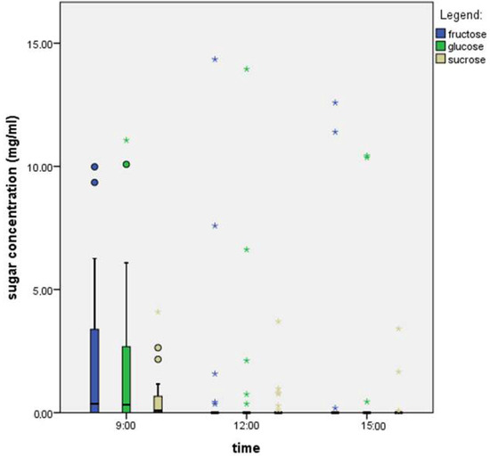 Glucose was the most abundant in the morning and at noon, while fructose predominated in the afternoon (Figure 2). Using the Kruskal–Wallis test, we identified statistically significant differences between the time points (SAH: 0.00, GLU: 0.000, and FRU: 0.000). The Mann–Whitney U test confirmed statistically significant differences in the concentrations of all three sugars between 9:00 and 12:00, as well as between 12:00 and 15:00, which means that the time of day affects the sugar concentration.