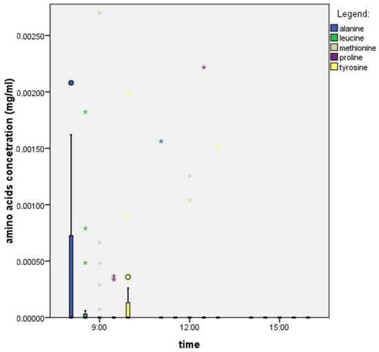 In calculating the average amino acid concentrations (Table 3), we found that the total concentration of amino acids was highest in the morning (0.057 mg/mL) and decreased over the course of the day—at noon, it was 0.015 mg/mL, and it was 0.010 mg/mL in the afternoon. The time of sampling influenced the concentration of amino acids, but it did not affect the dominant amino acid throughout the day, which was proline.