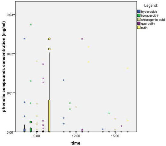 In calculating the average concentrations of phenolic compounds (Table 4), we found that the total concentration was highest at noon (0.054 mg/mL) and in the morning (0.043 mg/mL), and it decreased over the afternoon to 0.0067 mg/mL. The time of sampling influenced both the concentration of phenolic compounds and the dominant phenolic compound. Rutin was predominant in the morning and at noon, while quercetin became dominant in the afternoon.
