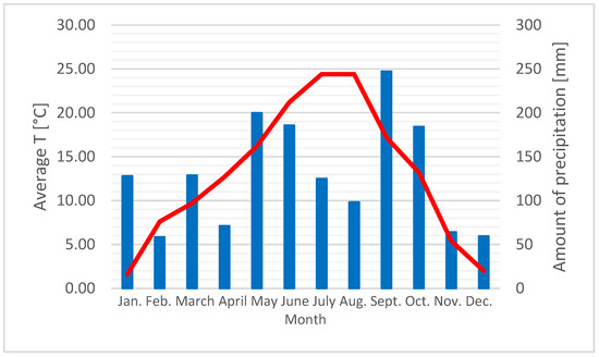 Ljubljana is situated in the central part of Slovenia and has a moderately continental climate. Winters often bring temperatures below freezing, while summers are warm. Precipitation is more frequent in spring and autumn [56]. Slovenia lies at the intersection of four biogeographic regions: Alpine, Dinaric, Pannonian, and Sub-Mediterranean. It is located in a moderately warm climatic zone. Due to Slovenia’s transitional position, the influence of the following phytogeographic regions can be felt: Alpine, Dinaric, and Sub-Mediterranean. Average annual temperature and precipitation are shown in Figure 6.