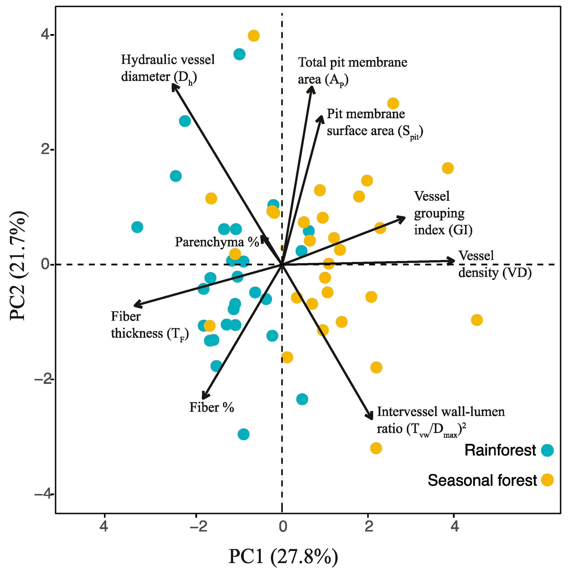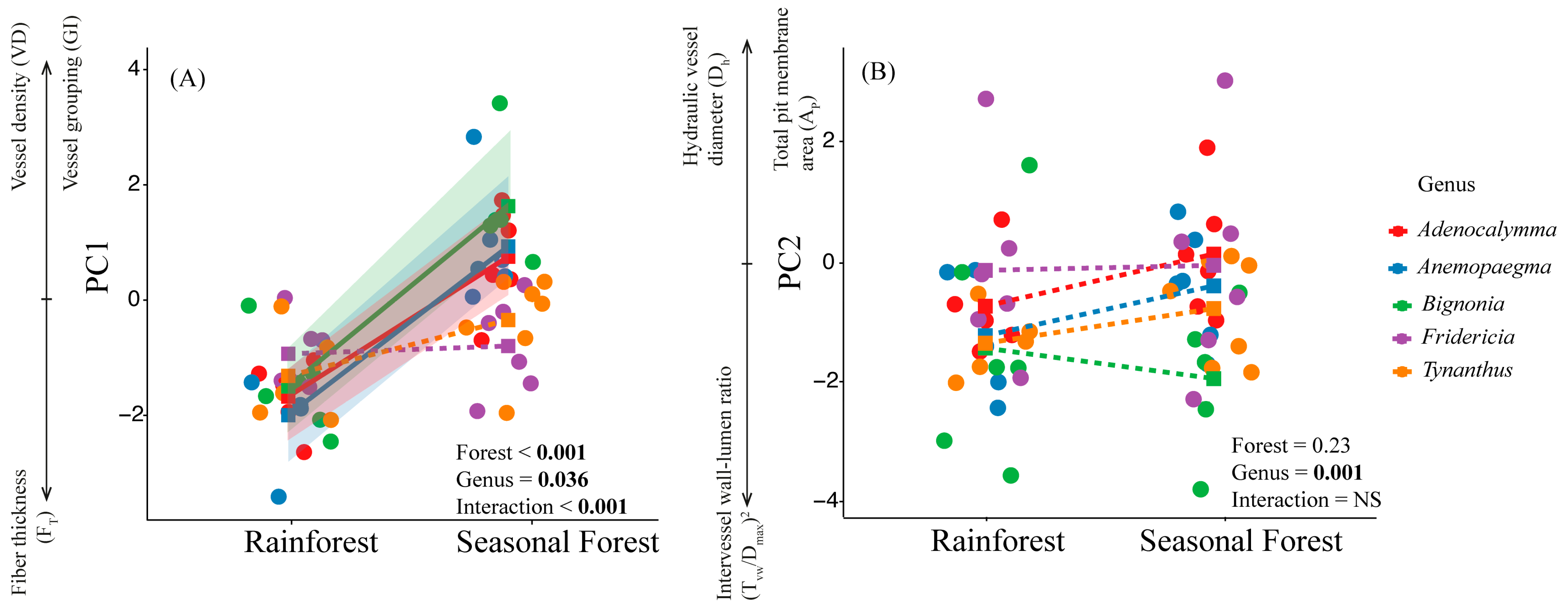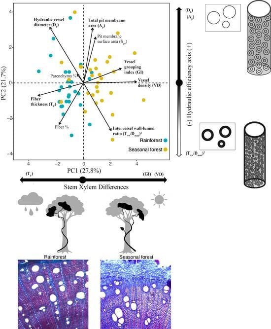 3.1. Lianas from Tropical Forests with Different Water Regimes Have Divergent Xylem Features