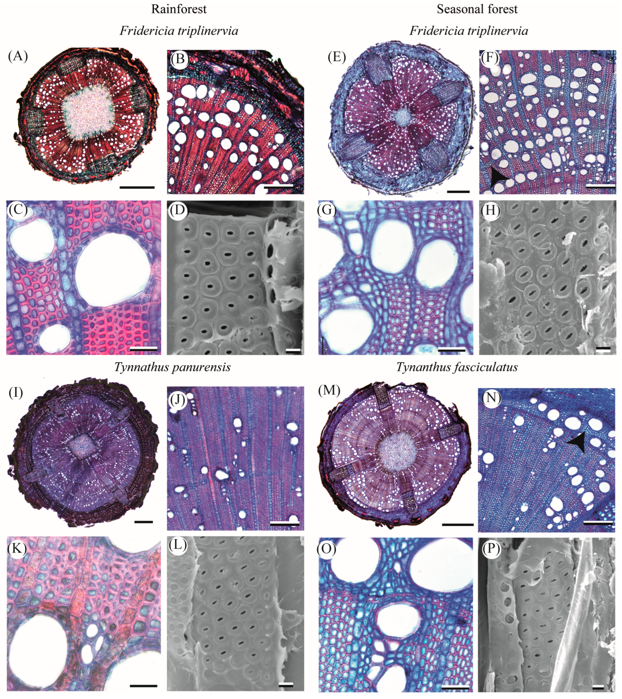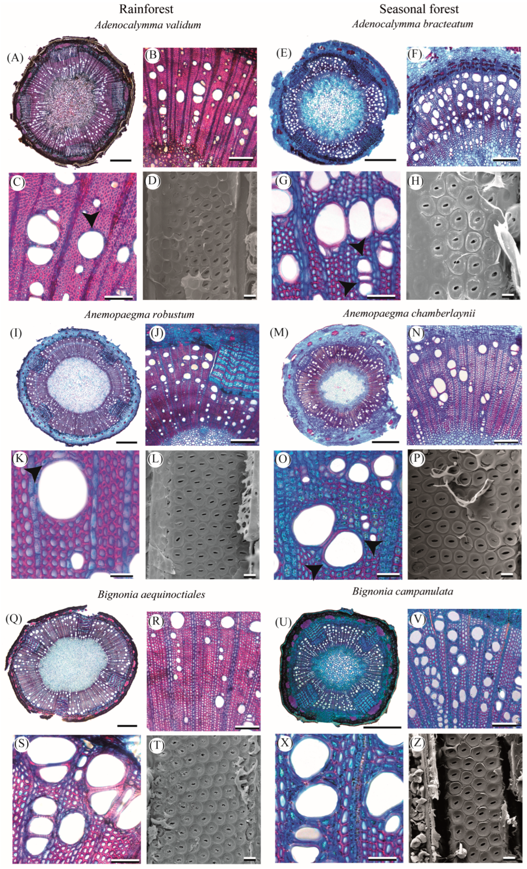 - Gerolamo, C.S.; Nogueira, A.; Pace, M.R.; Angyalossy, V. Interspecific anatomical differences result in similar highly flexible stems in Bignoniaceae lianas. Am. J. Bot. 2020, 107, 1622–1634. [Google Scholar] [CrossRef]