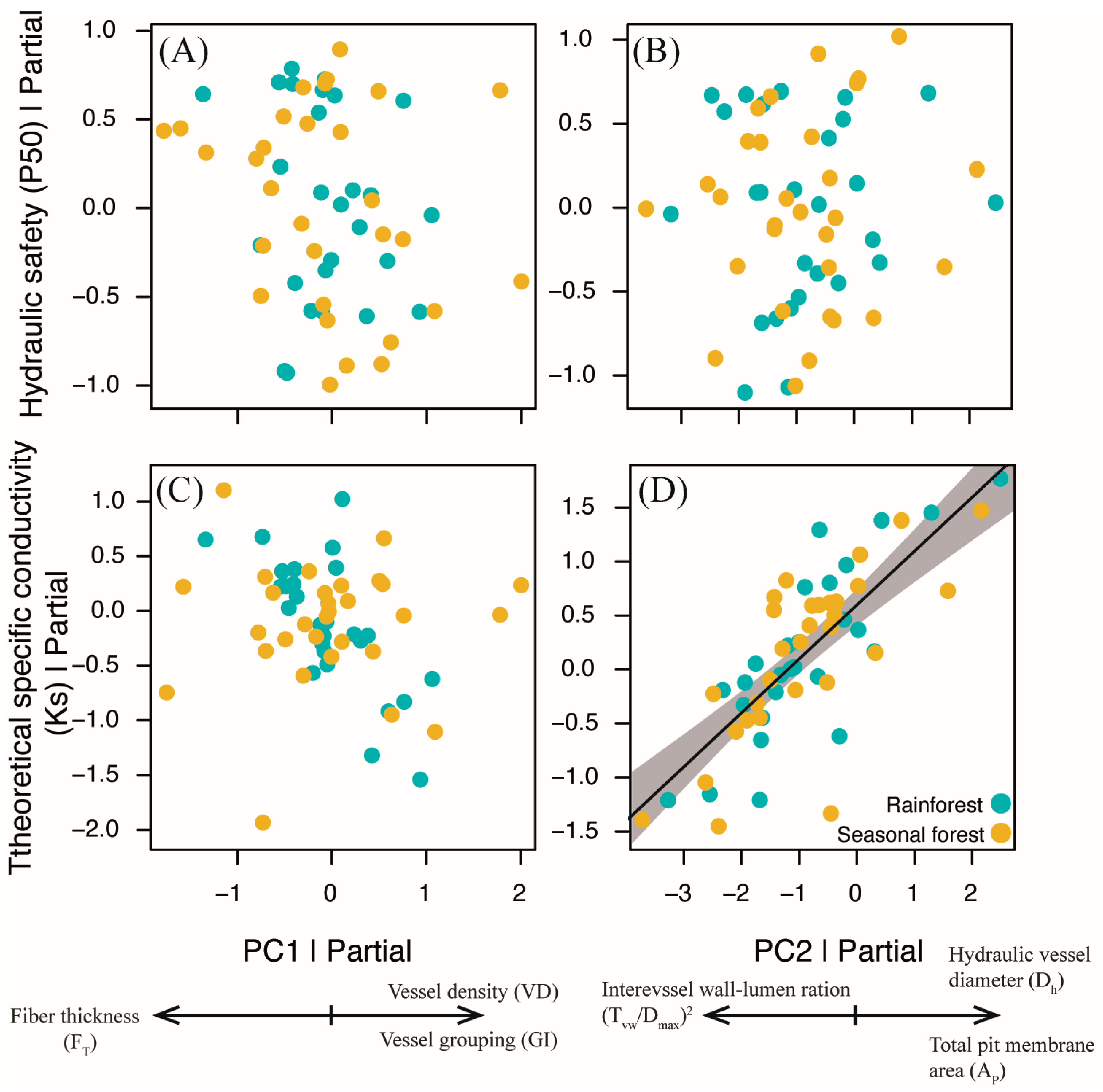 - Apgaua, D.M.G.; Tng, D.Y.P.; Laurance, S.G.W. Tropical wet and dry forest tree species exhibit contrasting hydraulic architecture. Flora 2022, 291, 152072. [Google Scholar] [CrossRef]