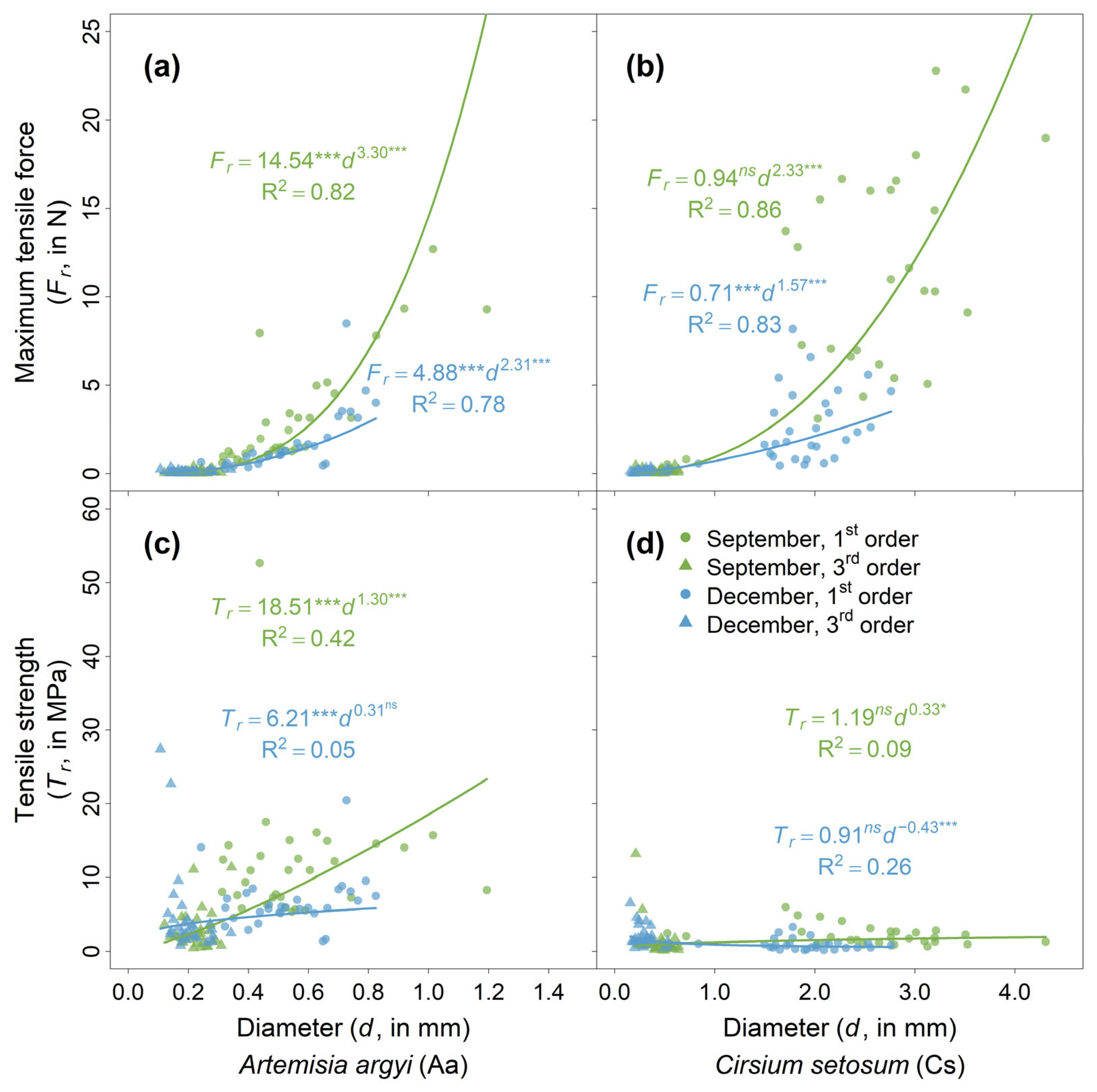 APA StyleJi, K., Deng, C., Ye, L., Liu, Y., Liu, F., Mao, Z., & Zuo, J. (2025). Does Root Tensile Strength Exhibit Seasonal Variation? Evidence from Two Herbaceous Species. Plants, 14(19), 2957. https://doi.org/10.3390/plants14192957