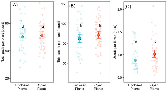Effects of pollination treatment on soybean reproductive variables at the plant level. (A) Total pods per plant, (B) total seeds per plant, and (C) seed set (seeds per flower) under two treatments: Enclosed (pollinator-excluded; blue) and Open (pollinator-accessible; red). Transparent circles show raw data (jittered); filled circles with error bars indicate predicted means ± 95% confidence intervals from Gaussian models. Different letters indicate significant differences between treatments (Bonferroni-adjusted comparisons, p < 0.05).