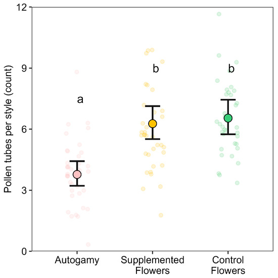 Pollen-tube growth under three pollination treatments: Autogamy (pink), Control Flowers (CF; green), and Supplemented Flowers (SF; yellow). Transparent circles represent individual flower-level data (jittered); filled circles and error bars show predicted means ± 95% confidence intervals from a Poisson model. Different Letters denote statistically significant differences among treatments (Bonferroni-adjusted comparisons, p < 0.05).