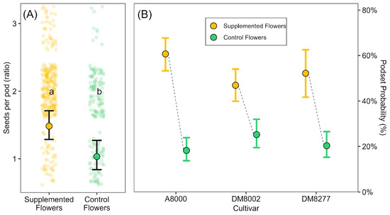Effects of pollen supplementation on flower-level reproductive outcomes. Supplemented Flowers (yellow) and Control Flowers (green) are shown in both panels. Transparent circles indicate raw data, and filled circles with error bars show model-predicted means ± 95% confidence intervals. (A) Seeds per pod (excluding zero-seed pods) from the count component of a hurdle model. Different letters indicate significant differences between treatments (Bonferroni-adjusted comparisons, p < 0.05). (B) Probability of pod set across three cultivars (A8000, DM8002, DM8277) from the zero-inflation component of the same model. A significant treatment × cultivar interaction was detected.