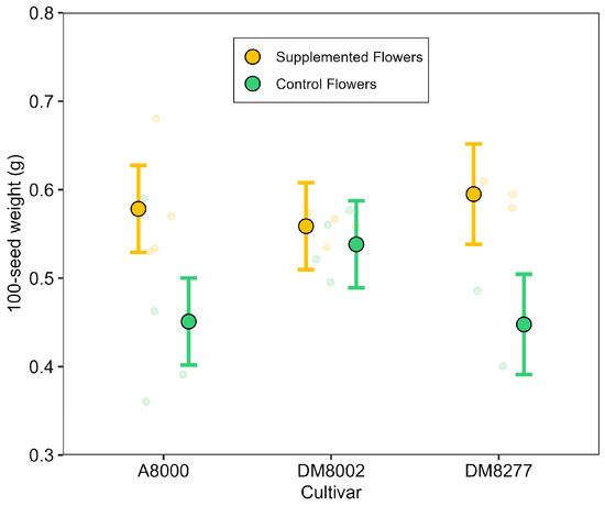 Seed weight (grams per 100 seeds) across three soybean cultivars (A8000, DM8002, DM8277) under two treatments: Supplemented Flowers (yellow) and Control Flowers (green). Transparent circles represent raw data; Treatment × cultivar interaction was significant; filled circles and error bars show model-predicted means ± 95% (Gaussian GLMM) for each combination.