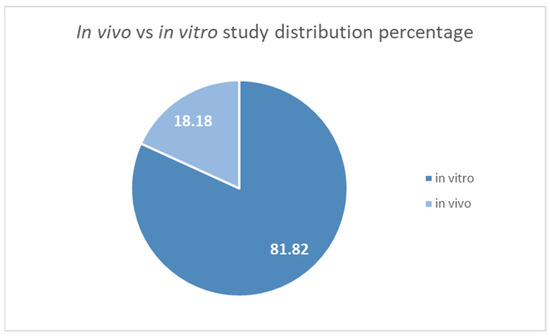 Distribution percentage of in vivo vs. in vitro assays performed in cytotoxic studies.