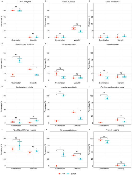 Germination and mortality rates of seeds of 12 plant species from the Napahai wet meadow. Subplots (A–L) represent comparisons of germination percentage and mortality under control and burial treatments for each of the 12 species, respectively. Significant differences were determined by paired t-tests: ns, no significant difference, * p < 0.05, ** p < 0.01, *** p < 0.001. Error bars represent standard errors. CK: control treatment; Burial: in situ burial treatment.