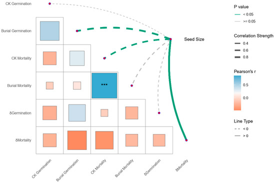 A correlation network analysis was constructed between seed size and: (1) germination and mortality rates in control groups, (2) germination and mortality rates in burial groups, and (3) relative change rates of germination and mortality between treatments. Results are presented in Figure 2. Results demonstrated that seed size exhibited a highly significant negative correlation with germination rate in burial groups (p < 0.01), a significant negative correlation with mortality rate in control groups (p < 0.05), and a highly significant positive correlation with the relative change rate of mortality (p < 0.01).