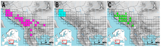 Distribution of Gentiana acaulis (A), Gentiana clusii (B), and Gentiana dinarica (C) on the Balkan Peninsula given in MGRS, grid cells 50 × 50. Based on [4] and field work of the authors.