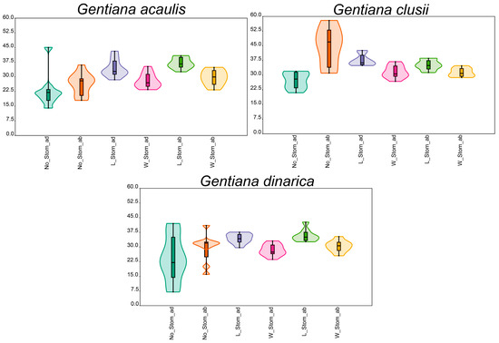 Out of all analysed characters, it was found that the number of stomata, especially on the abaxial side of the leaf (No_Stom_ab), was the only variable that allowed for the clear differentiation of the species (Table 2, Figure 5). The species G. clusii was found to have the highest number of stomata on the abaxial side of the leaf, while the other two species had a similar number (Table 2, Figure 5). The number of stomata on the adaxial side of the leaf (No_Stom_ad) has been shown to be the most plastic of the analysed traits in G. dinarica, in contrast to the other two species (Table 2, Figure 5). All other characters, length of the stomata on the adaxial side of the leaf (L_Stom_ad), length of the stomata on the abaxial side of the leaf (L_Stom_ab), width of the stomata on the adaxial side of the leaf (W_Stom_ad), and width of the stomata on the abaxial side of the leaf (W_Stom_ab), are similar among studied species and do not provide sufficient information for their delimitation (Table 2, Figure 5). A complete dataset with the results of the measurements for all characters and samples is provided in the Supplementary Material.