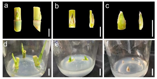 Effects of different explants on bud induction. (a–c) Morphological characteristics of axillary buds with whole cane fragments, axillary buds with incomplete cane fragments, and axillary buds without cane fragments, respectively; (d–f) Induction effects of axillary buds with whole cane fragments, axillary buds with incomplete cane fragments, and axillary buds without cane fragments cultured on MS medium supplemented with 5.0 mg/L 6-BA and 1.0 mg/L IBA for 15 days, respectively. Bars = 1 cm.