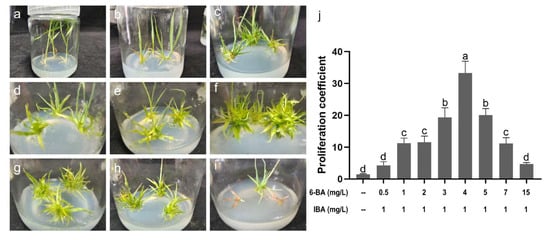 Effects of various combinations of 6-BA and IBA on bud proliferation. (a) Proliferation effect of individual buds cultured on MS medium not supplemented with hormones for 30 days; (b–i) Proliferation effect of individual buds cultured on MS medium containing 0.5, 1.0, 2.0, 3.0, 4.0, 5.0, 7.0, and 15.0 mg/L 6-BA and 1.0 mg/L IBA for 30 days, respectively; (j) Proliferation coefficient of individual buds cultured on various media for 30 days; the means (n = 3) denoted by the same letter are not significantly different according to the LSD test at p = 0.05.