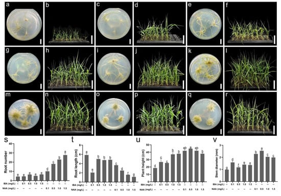 Rooting and acclimation effects of seedlings derived from various media. (a,b) Rooting and acclimation effects of seedlings from 1/2 MS containing no hormones; (c,e,g,i) Rooting effects of seedlings from 1/2 MS containing 0.1, 0.5, 1.0, 1.5 mg/L IBA, respectively; (d,f,h,j) Acclimation effects of seedlings from 1/2 MS containing 0.1, 0.5, 1.0, 1.5 mg/L IBA, respectively; (k,m,o,q) Rooting effects of seedlings from 1/2 MS containing 0.1, 0.5, 1.0, 1.5 mg/L NAA, respectively; (l,n,p,r) Acclimation effects of seedlings from 1/2 MS containing 0.1, 0.5, 1.0, 1.5 mg/L NAA, respectively; (s,t) Root number and root length of seedlings from various media; (u,v) Plant height and stem diameter of seedlings from various media following acclimation for 30 days. Bars = 1 cm in (a,c,e,g,i,k,m,o,q), 10 cm in (b,d,f,h,j,l,n,p,r); the means (n = 3) labeled with the same letter are not significantly different according to the LSD test at p = 0.05 in (s–v).