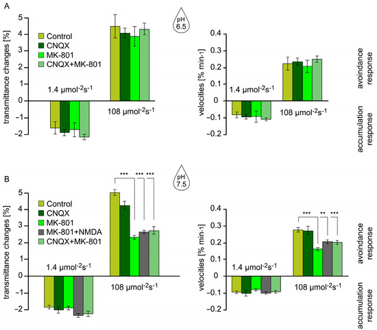 2.2. Effect of GLR Inhibitors at pH 6.5 and pH 7.5 on Chloroplast Movements