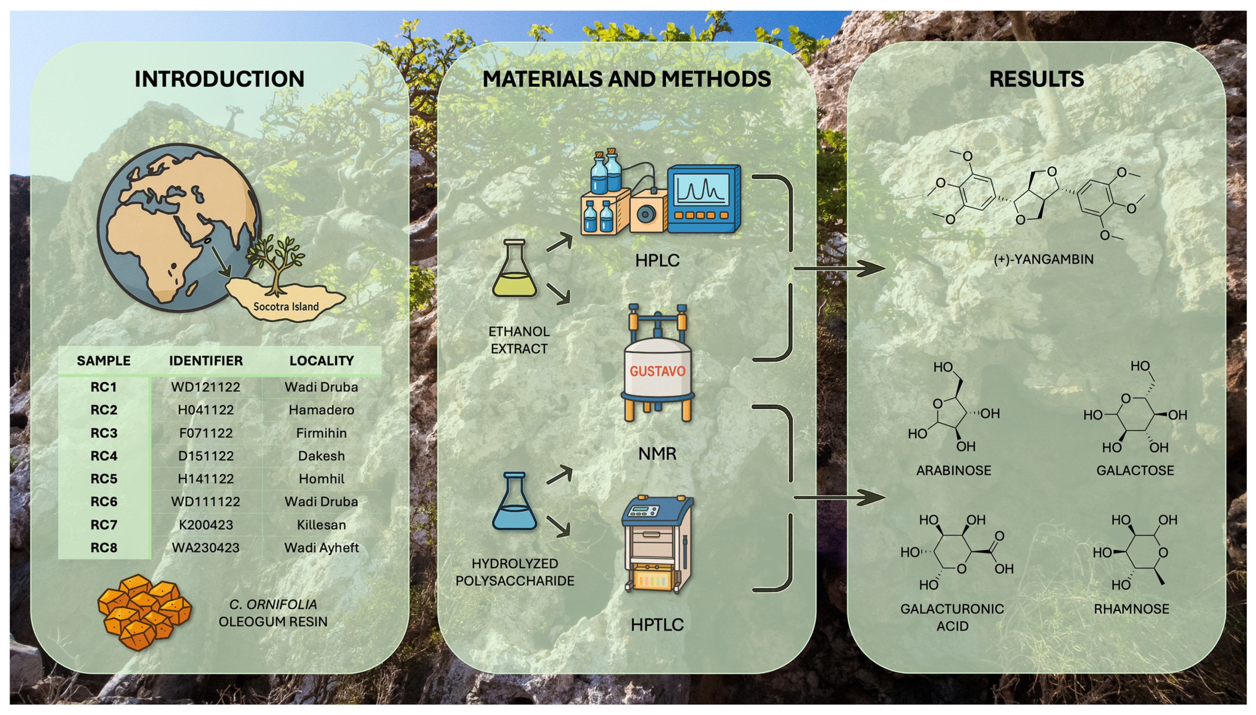 Bortolami M, La Montagna D, Toniolo C, Sciubba F, Patriarca A, Moretti T, Serafini I, Mura F, Cocco E, Maděra P, et al. Preliminary Insights into the Non-Volatile Constituents of Commiphora ornifolia (Balf.f.) J.B.Gillett Oleogum Resin from Socotra Island. Plants. 2025; 14(19):2999. https://doi.org/10.3390/plants14192999