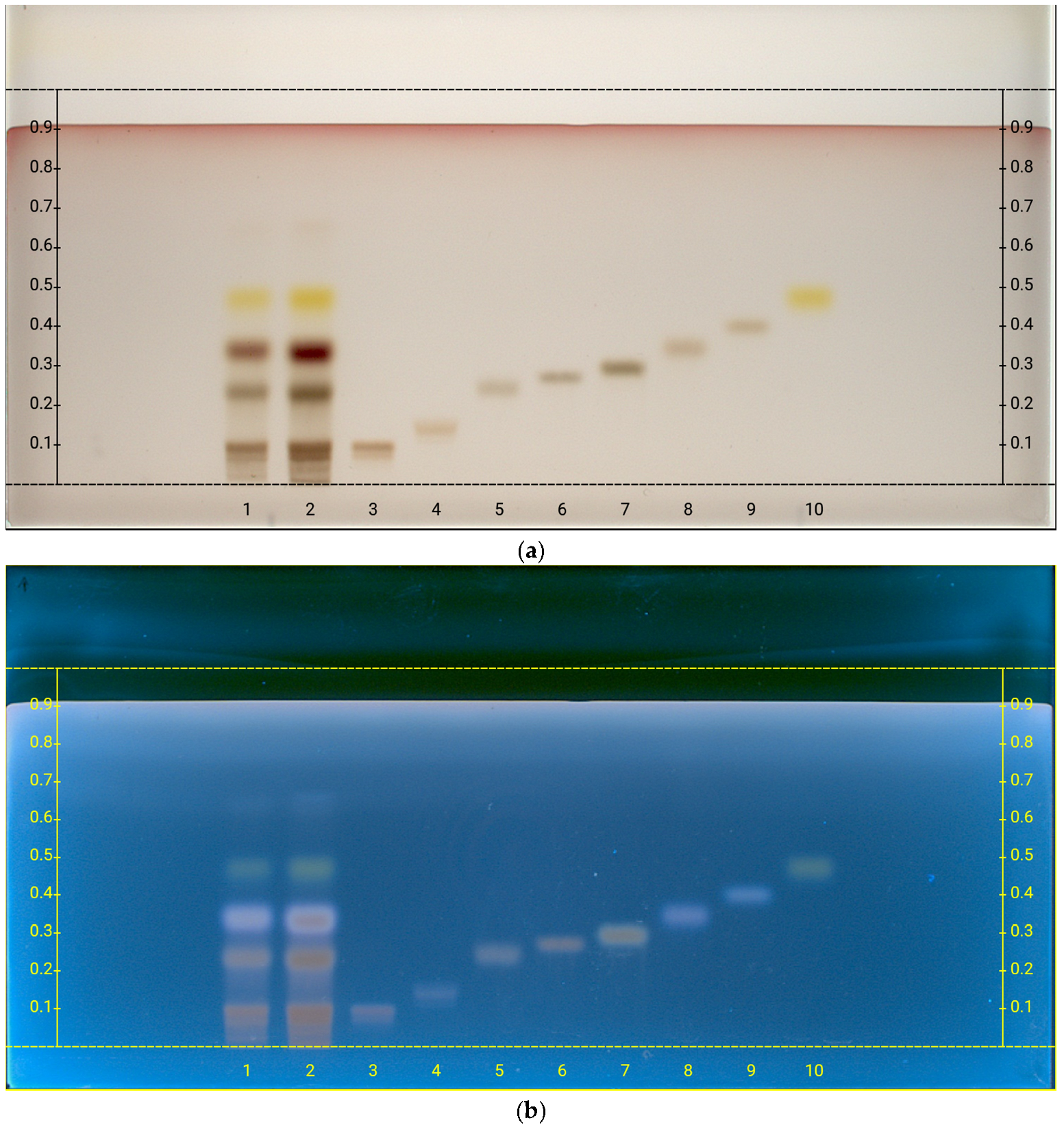 - Yang, C.; Guan, J.; Zhang, J.S.; Li, S.P. Use of HPTLC to differentiate among the crude polysaccharides in six traditional Chinese medicines. JPC-J. Planar Chromat. 2010, 23, 46–49. [Google Scholar] [CrossRef]