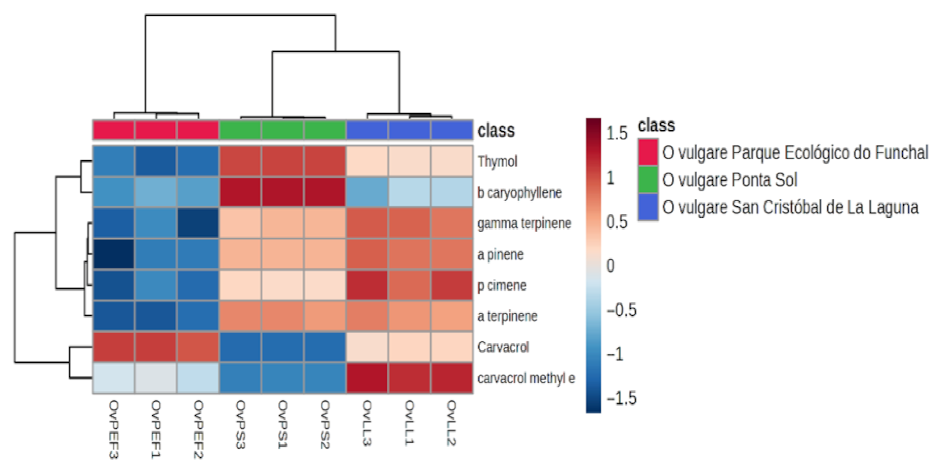 Methyl ether terpenes | Carvacrol methyl ether | 1549 | 1231 | 1.96 ± 0.09 a | 0.87 ± 0.07 b | 4.71 ± 0.15 c |