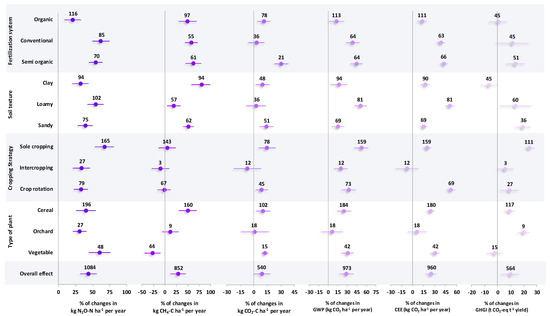 Percentage changes of GHG parameters affected by a variety of effective factors including fertilization systems, soil textures, cropping strategies, and types of plants. Subgroups with overlapped CIs on the vertical zero line suggest no significant change in property. Subgroups with overlapping CIs with each other are not significantly different.
