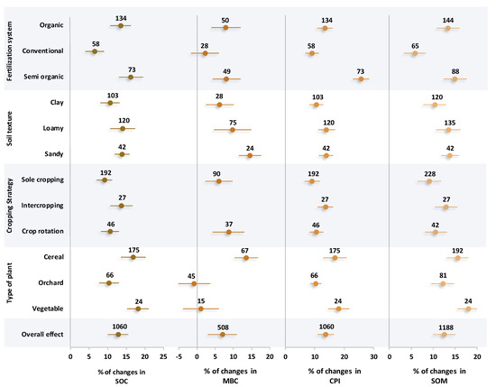 Based on the results, different fertilization systems, soil textures, cropping strategies, and plants significantly (p < 0.05) changed the status of carbon in soil (Figure 2). In detail, semi-organic and organic systems of fertilization did not show notable differences with each other in most of the C indices, and considerably increased the SOC, MBC, and SOM with 14.9%, 8.1%, and 14.3% positive effect sizes on average, respectively. However, in the case of CPI, semi-organic, organic, and conventional resulted in positive effect sizes of 25.8%, 12.4%, and 9.1%, respectively. Although there was no significant difference among the three types of soil textures in terms of the soil carbon status, an increase in coarse mineral particles of soil resulted in an ascending trend in the soil C indices. Based on the results, clay, loamy, and sandy textures caused an increase in MBC with positive effect sizes of 6.3%, 9.8%, and 14.5%, respectively. On average, loamy and sandy soils resulted in 13.9%, 14.1%, and 13.6% positive effect sizes in SOC, CPI, and OM, respectively. Although there was no significant difference among different crop strategies, the intercropping strategy showed the best performance with the highest SOC (13.7%), CPI (13.6%), and OM (12.9%). In terms of plant type, the highest MBC was observed from cereal cultivation, with a 13.5% positive effect size higher than vegetable and orchard. However, there were no significant differences in terms of SOC between vegetable and cereal, with a positive effect size of 17.6% on average.